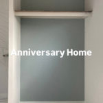 収納スペースの中にだけ、おちついたくすみブルーと、柔らかなグレーのアクセントクロスを。