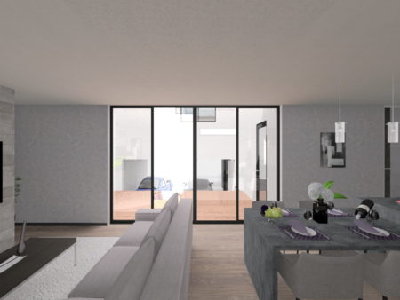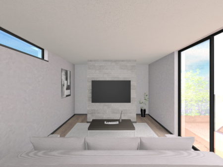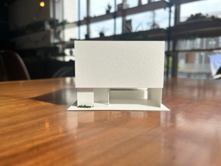 リビングから中庭を通してガレージを眺める