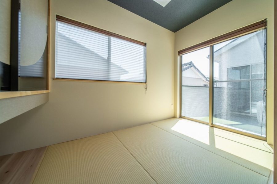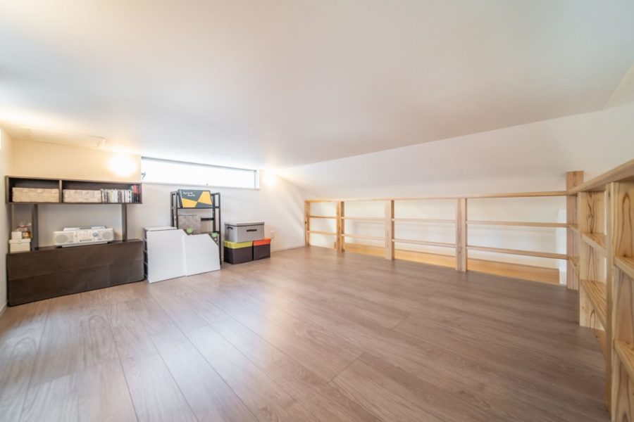 2階リビングならではの勾配天井を活かした吹抜けと大空間のロフト。 誰の視線も気にせずに家族がゆっくり寛げる暮らし。料理中はどうしてもお子さんから目が離れてしまう時があり、キッチンのすぐ横に繋がりある和室が便利です。